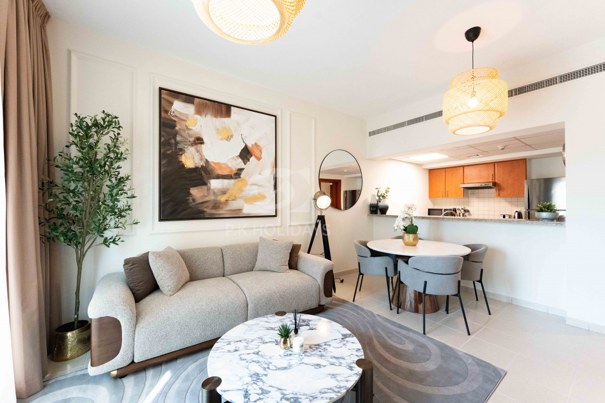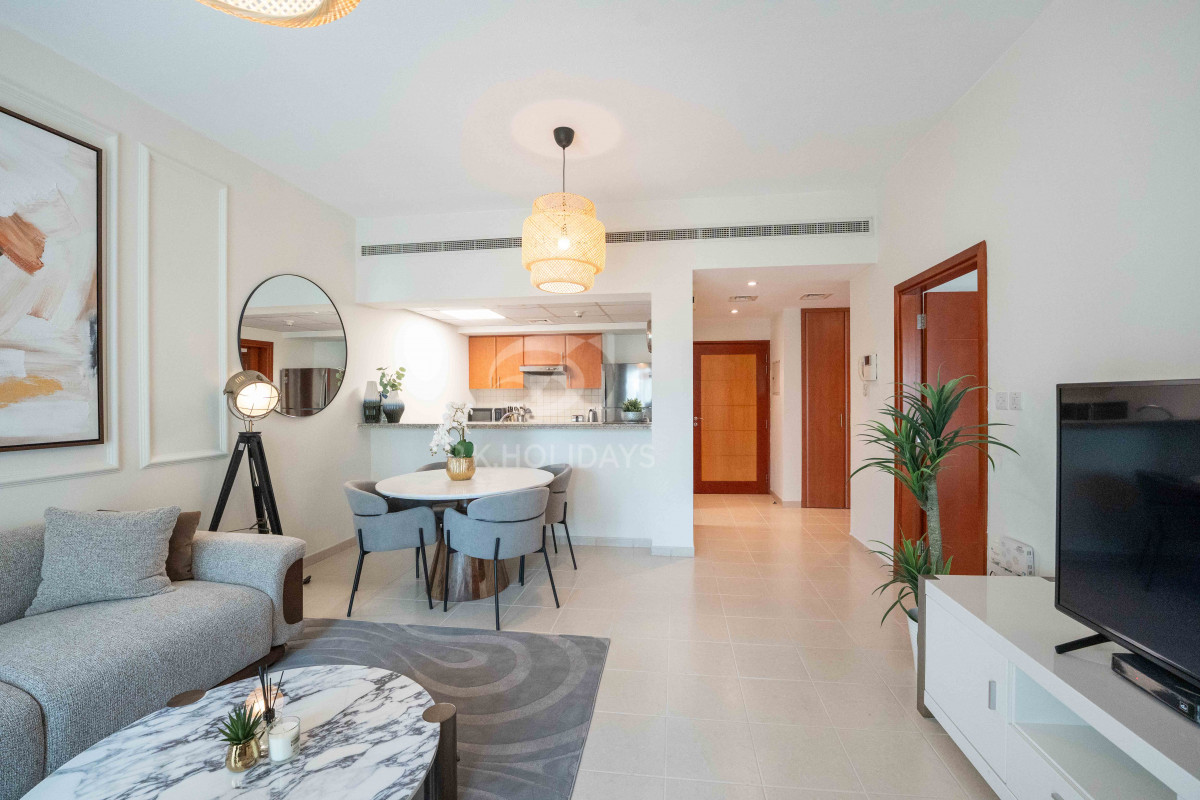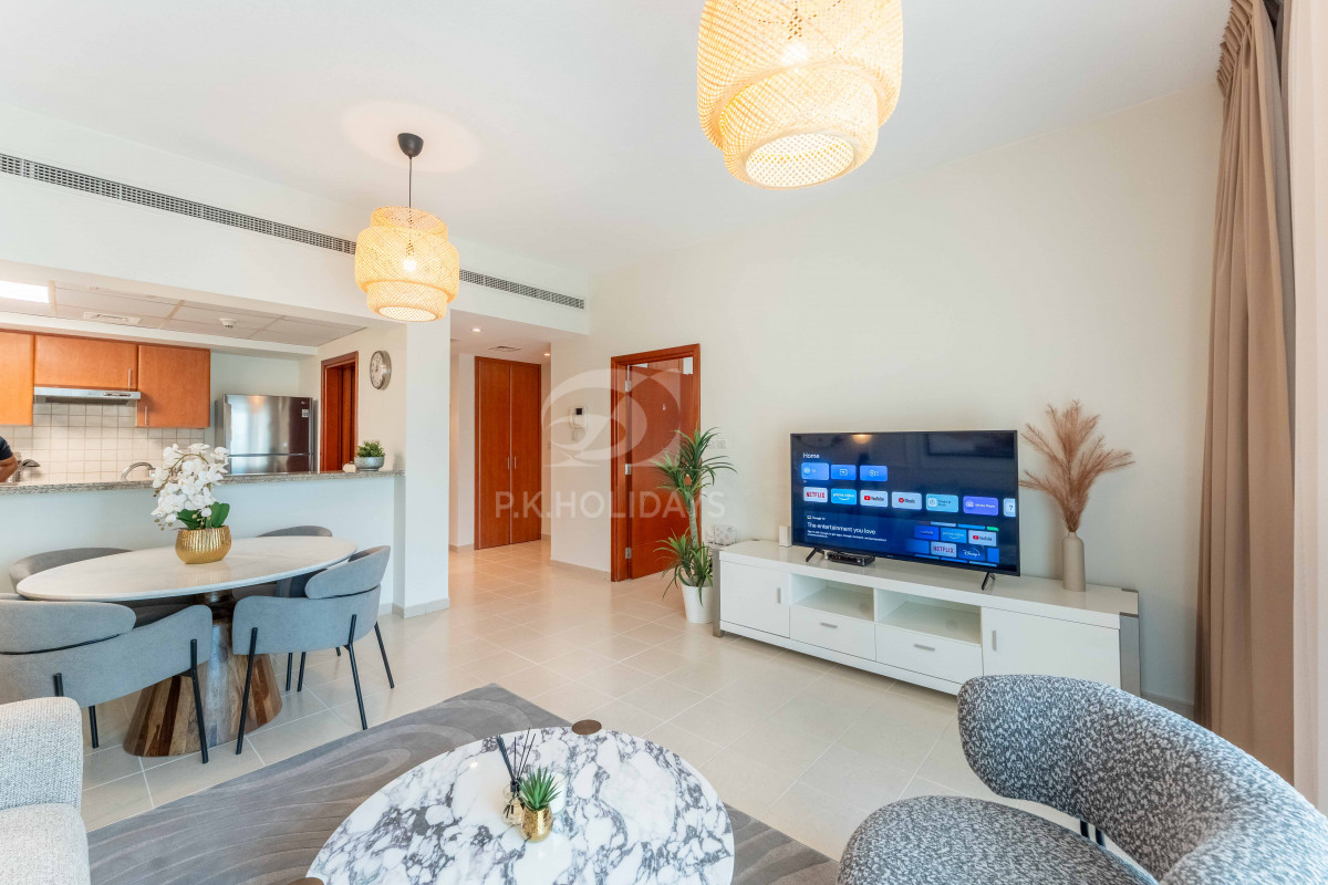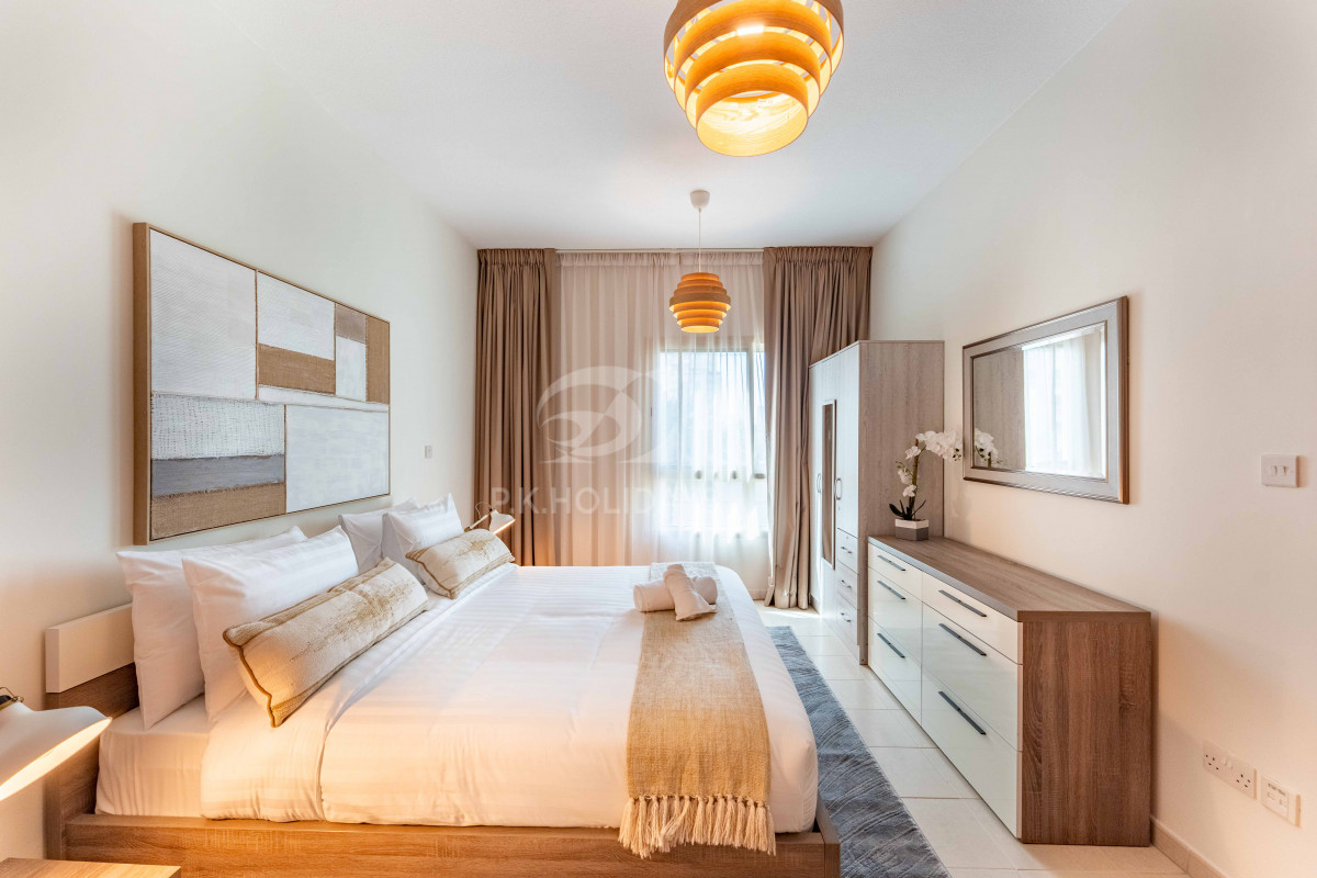 PK Holidays is proud to present this 1 bedroom furnished apartment located in the sought after family community of Al Arta , The Greens. The Greens is an established family community, set just off the Sheikh Zayed Road, and enclosed in dense landscaping and water features with well-maintained community amenities, such as BBQ area, Gym, Swimming Pool. The community houses a Village Centre, which has a supermarket, pharmacy, boutique restaurants and fast-food outlets. This holiday home is a comfortably furnished, modern 1 bedroom apartment, fully fitted for your ease and requirements. The apartment features an open-plan Living, Dining & Kitchen Area, which is fully equipped with all cutlery and crockery, dishwasher, washing machine, cooker, microwave, kettle, toaster, coffee machine. The bedroom fits a queen-size bed with an en-suite bathroom. Key Features & Amenities: - Free once-a-week Cleaning - 24/7 Security -Modern Gymnasium - Swimming Pool Apartment Amenities - Fully Sanitized Apartment - 24/7 guest services - Full-equipped apartment - Storage Room - Park and Pool View - High-Speed WiFi Price is inclusive of all the utility bills. Extra Charges/Taxes: AED 10 per night for the first 30 nights; 5% VAT Dubai Tourism Fee AED 3,000 Refundable Security Deposit *Prices are subject to change based on season and availability. Bed linen and towels are provided. There is extra powder room for the guests in the corridor. Additional Z-bed available on request. Fee of AED 150 per night- Up to 6 nights stay. If staying more than 6 nights- Fee of AED 100 per night (for the Z bed). Baby Cot Free of charge (subject to availability). No Pets Allowed. The price includes 1 x week cleaning with bed linen change, water electricity bills, TV channels, internet connection. Contact Us on: +971 55 365 1051 / +971 4 4541140 Please Visit Our Website: www.pkholidays.ae